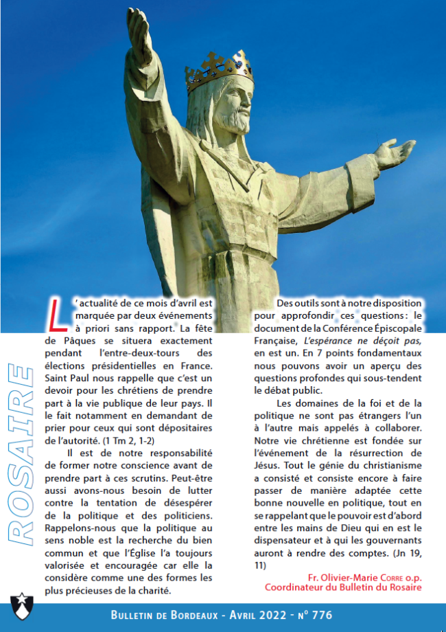 AU SOMMAIRE CE MOIS-CI Éditorial Deux remèdes contre la colère Les chrétiens face à l’autorité politique ? Pardonne-nous nos offenses… Informations régionales Méditations du Rosaire Pour lire l’ensemble du Bulletin mensuel…